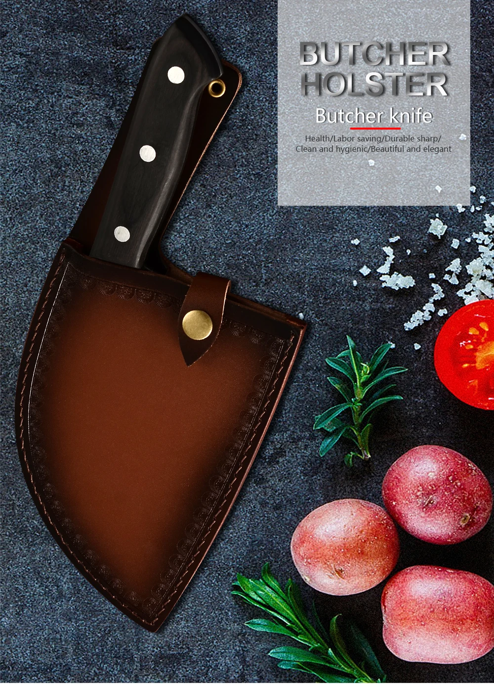 Ширина лезвия: 105 мм Длина лезвия: 165 мм Толщина лезвия: 5 мм Стиль ручки: полная ручка Tang Материал лезвия: кованая Высокоуглеродистая сталь, ручная работа Материал ручки: интегрированный Стальной хвостовик, дерево, заклепки Материал чехла: кожа