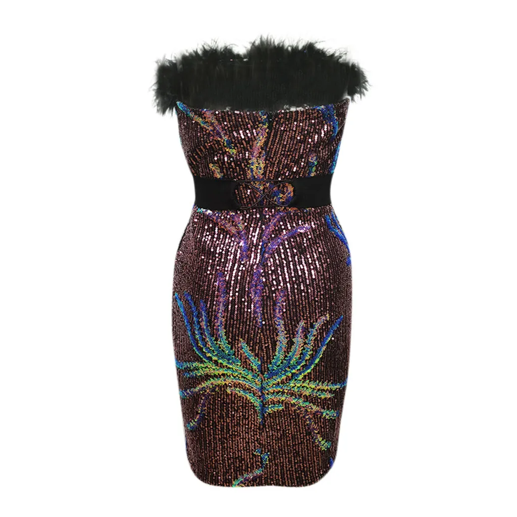 Летнее женское платье без бретелек с перьями в стиле пэчворк Мини сексуальное платье с блестками