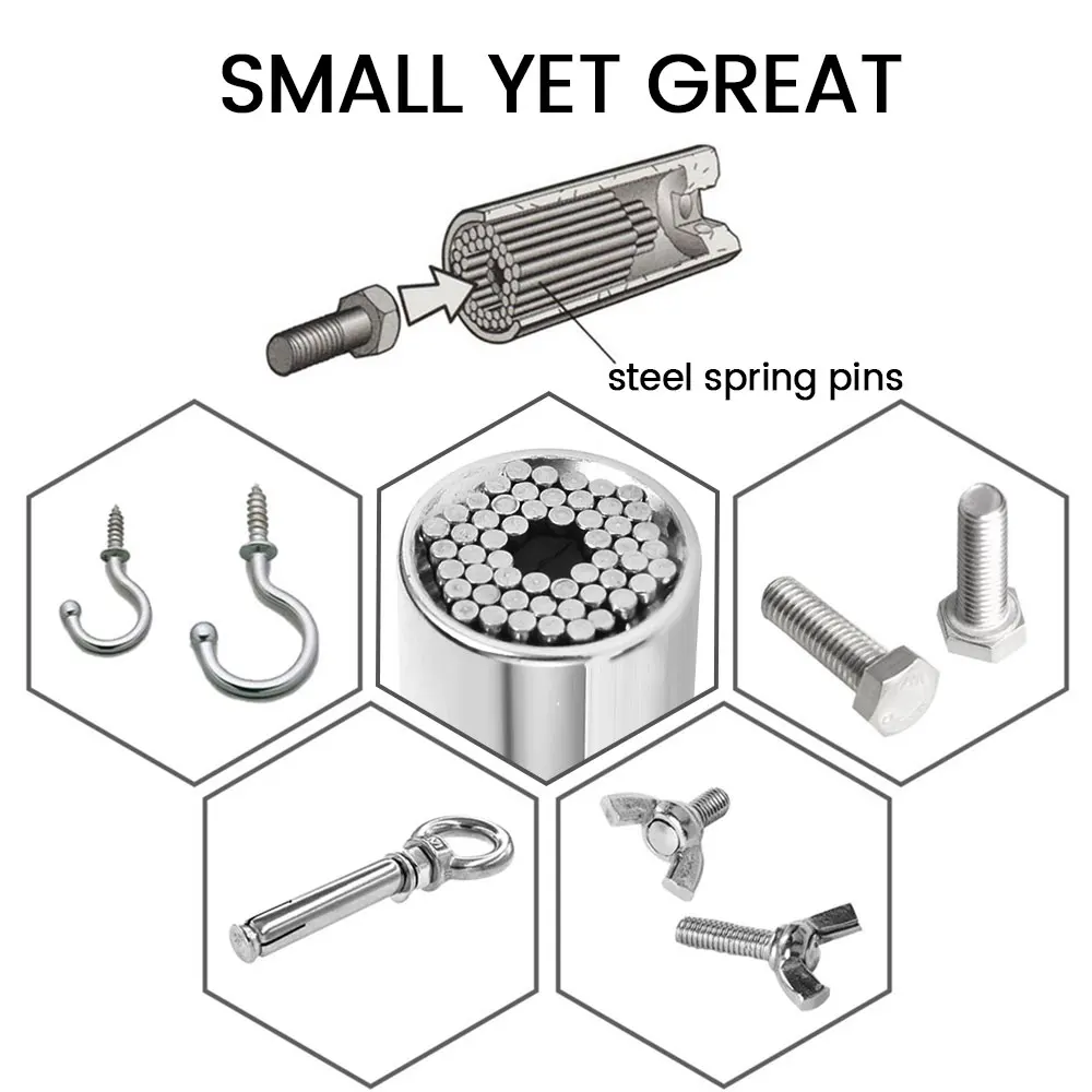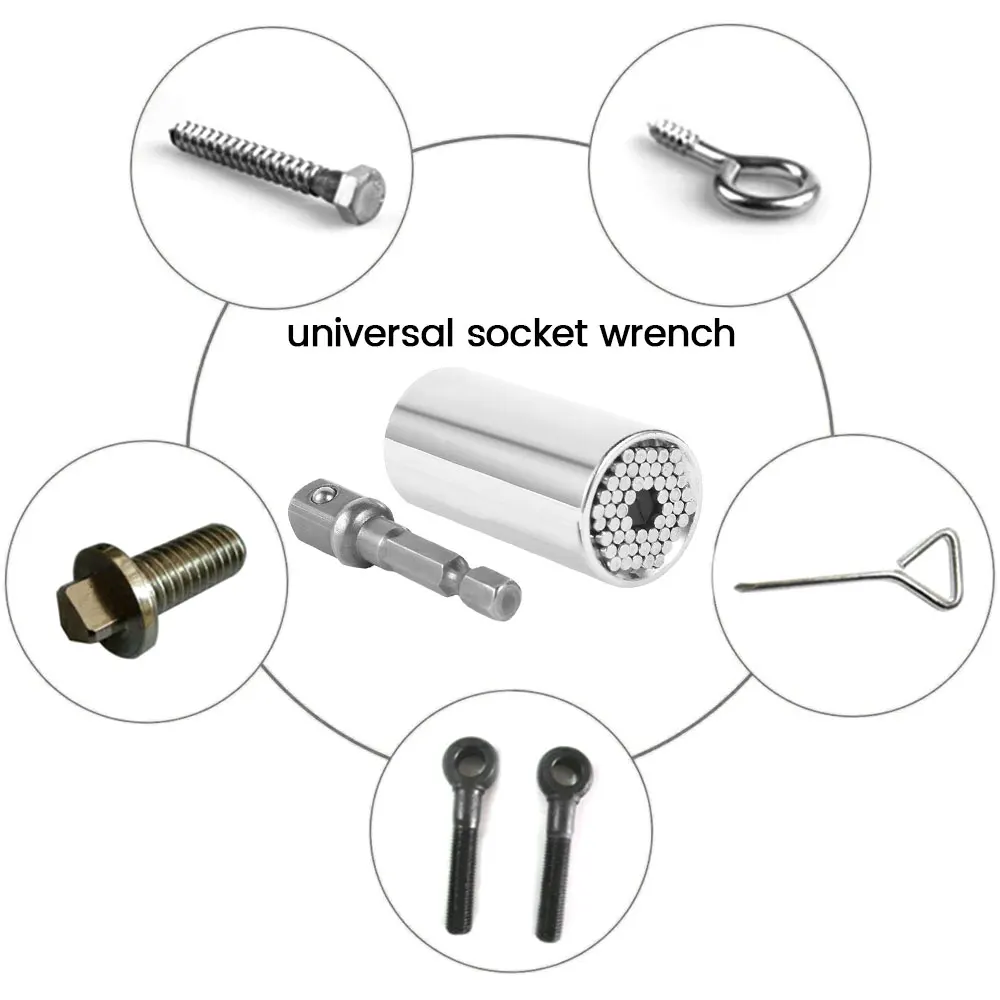 Универсальный адаптер для розетки может самостоятельно регулировать, подходя для тысяч крепежных элементов. Адаптер питания преобразует электрическую дрель в блок питания. Гаечный ключ с накатанной нескользящей ручкой, легко работать с небольшим усилием. Полированная хромированная отделка обеспечивает прочность и долговечность. Подходит для стандартных гаек и головок на 1/4-3/4 дюйма, метрических гаек и болтов 7-19 мм. Может использоваться для разборки гаек, винтов, крючков, винтов с задержками, головок болтов и т. Д. Подходит для автомобильной, обрабатывающей и других производств.