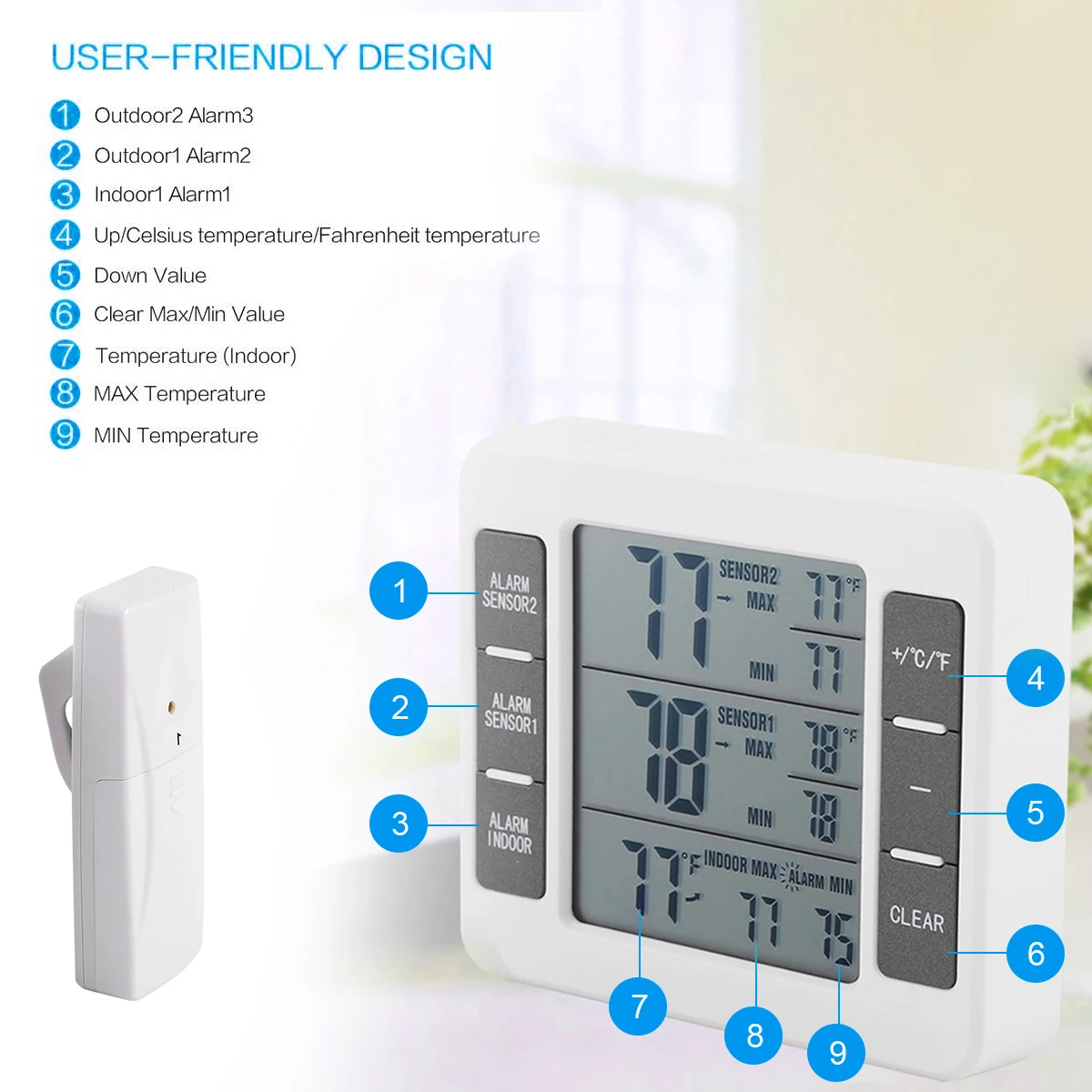 Это беспроводной цифровой Морозильный термометр. Его можно использовать в морозильной камере и использовать в качестве термометра внутри и снаружи. Его собственная звуковая сигнализация может предупредить вас о превышенной температуре во времени.