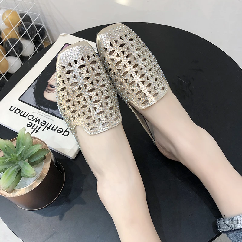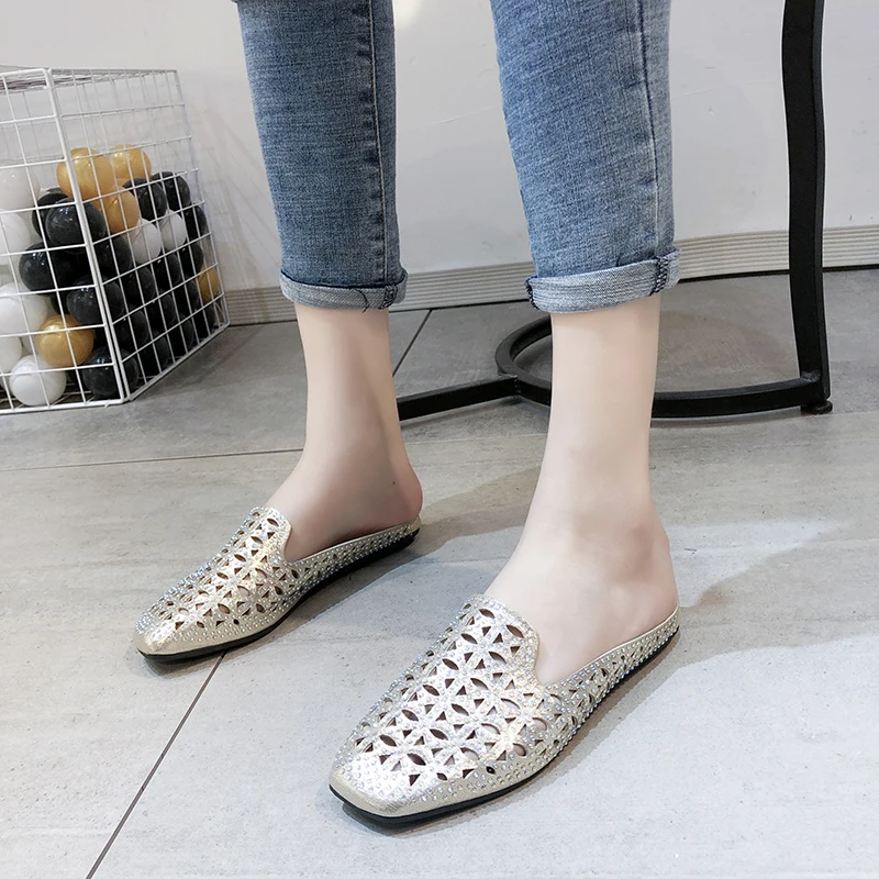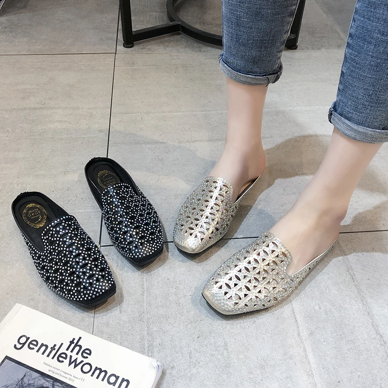 Женские Модные уличные тапочки; Повседневные открытые тапочки на плоской подошве; Женские домашние удобные тапочки с кристаллами; Женские домашние тапочки размера плюс