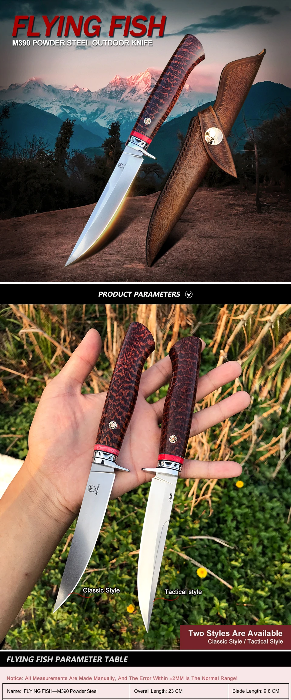 {Размер и материал} 1. 【Название: Летающий рыболовный нож 2. 【Общая длина 】: 23 см (9 дюймов) 3. 【blade length】: 9,8 см (3,9 дюймов) 4. 【blade width】: 2 см (0,79 дюйма) 5. 【blade thickness】: 3 мм (0,12 дюймов) 6. Вес: 95 г (3,35 унций) 7. 【Термическая обработка 】: вакуумная криогенная Термическая обработка 8.【Hardness】: 60-62HRC 9. 【Материал лезвия 】: M390 сталь 10. 【surface】: Классический: атласная отделка Тактический: stonewash отделка 11. 【Материал ручки 】: Snakewood + кость + нержавеющая сталь 12. 【Материал оболочки 】: сшитая вручную и резная кожа растительного дубления оболочка для пояса 13. 【Упаковка 】: подарочная коробка {Введение} долл. США 1. Это легкий Рыбалка нож около 95 г (3,35 унций). 2. Его лезвие изготовлено из стали M390, с твердостью 60-62HRC, высокой резкостью и хорошим удержанием. 3. Ручка изготовлена из драгоценного дерева и отполирована вручную опытными мастерами. Удобное сцепление и приятное украшение. 4. Оснащён кожаной оболочкой ручной работы для пояса, Давайте покатаемся с ней!