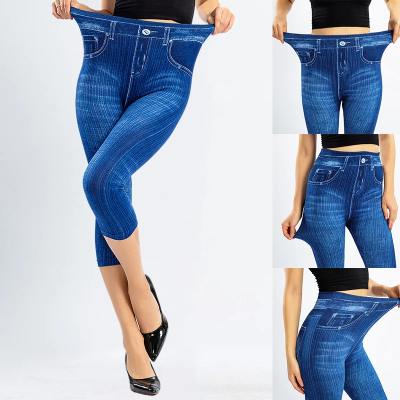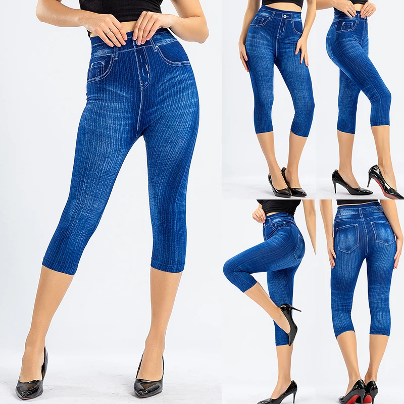Женские джинсовые леггинсы с принтом, модные обтягивающие эластичные брюки, укороченные брюки