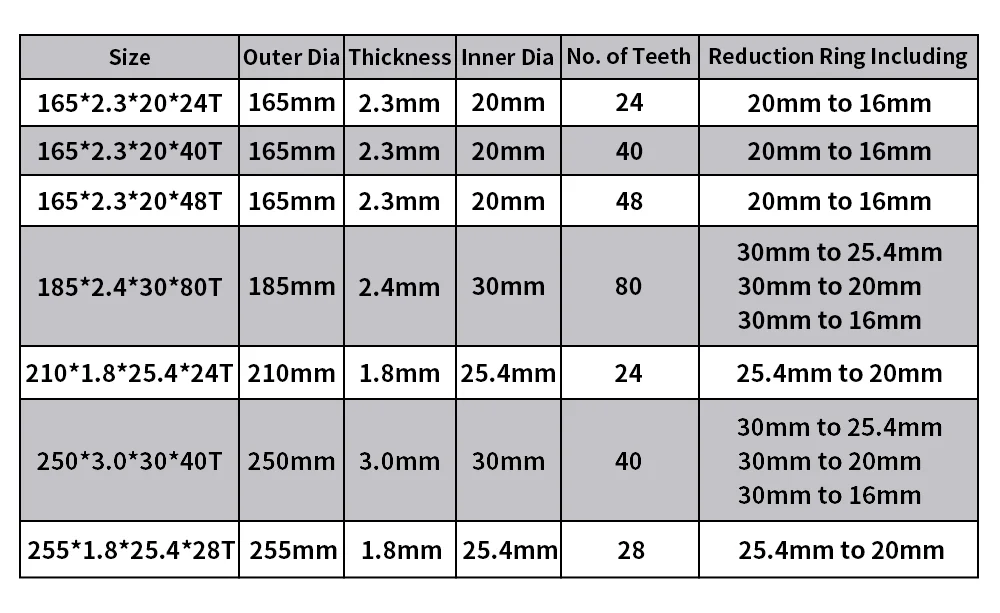-Внешний диаметр: 165/185/210/250/255 мм
