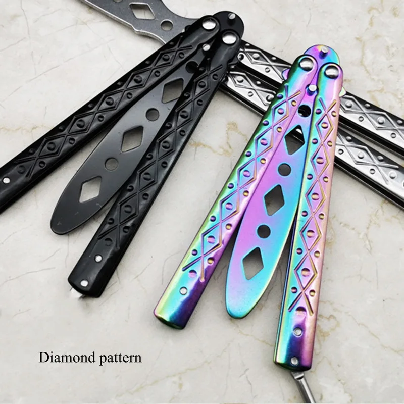 Нож-бабочка из нержавеющей стали, тренировочный нож, открытый нож для соревнований, тупой инструмент без лезвия Эта вещь предназначена только для практики использования, это складной нож, легко носить с собой. Лезвие имеет отверстия, таким образом, он может не быть заточенные. Это идеальный складной тренировочный нож-бабочка из нержавеющей стали, вы можете практиковаться, без вреда для здоровья. Ручка имеет ажурный дизайн, на ощупь и баланс лучше Общего применения на все случаи жизни, использовать для ежедневного домашних нужд Классический дизайн, процесс полировки поверхности, отличная текстура