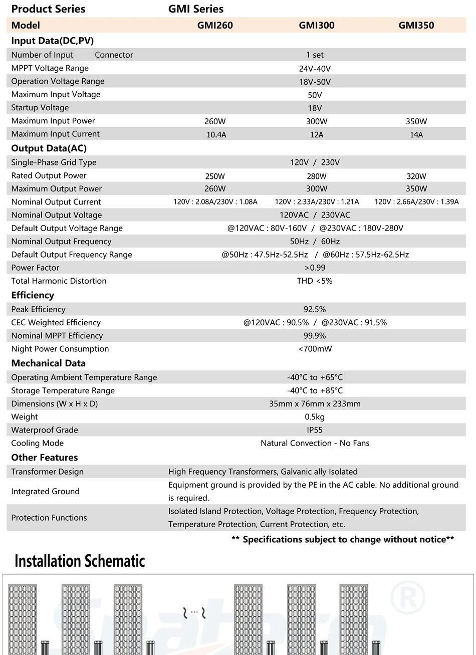 GMI Series 300W 350W 500W 600W 700W MPPT Solar Grid Tie Micro Inverter DC18V-50V to AC110V-230V 50HZ/60HZ Solar PV Inverter