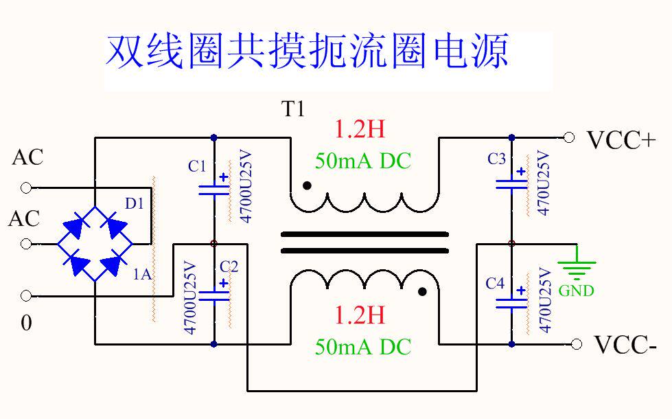 Обычный сенсорный дроссель подходит для фильтрации постоянного тока с положительным и отрицательным двойным напряжением. Дроссель расположен после того, как конденсатор фильтра выпрямителя, и выход дросселя соединен с фильтрующим конденсатором небольшой емкости для формирования a & pi;-образного фильтра, который может эффективно фильтровать переменный ток. Как показано ниже