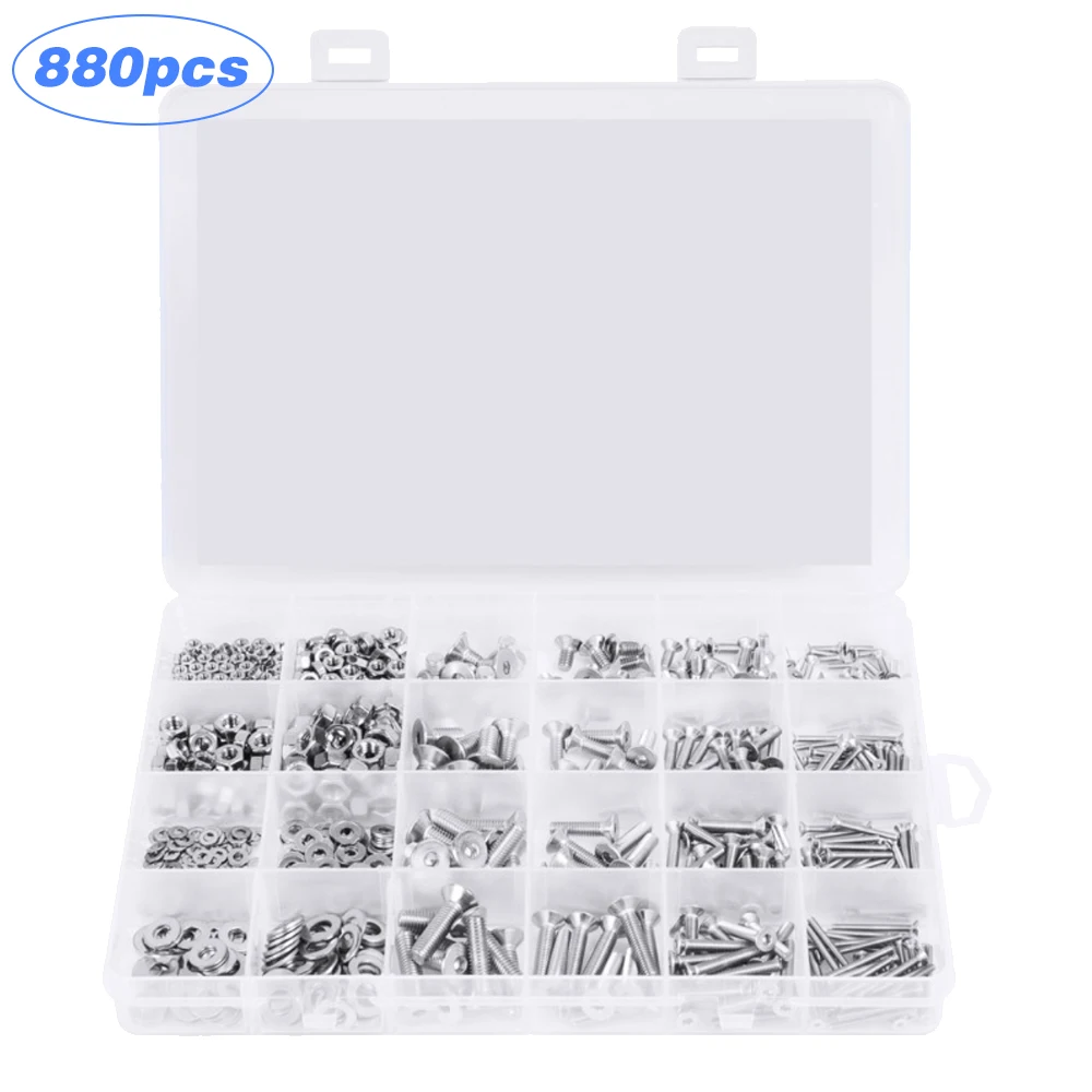 -880 шт. в комплекте: Винтовые гайки, шайбы и потайные шестигранные винты разных размеров.
