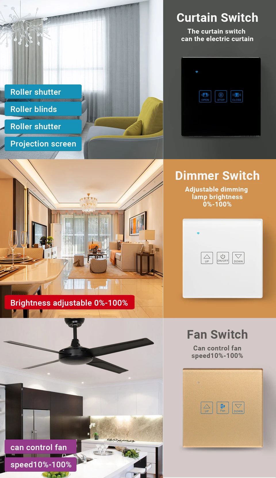 2. Сочетание различных сценариев: подходит для различных видов штор, таких как оконные жалюзи/рулонные жалюзи/венецианские жалюзи. Установите умный выключатель для штор во многих местах, таких как офис/кабинет/спальня/гостиная и т. Д., даже Управляйте тентом во дворе.