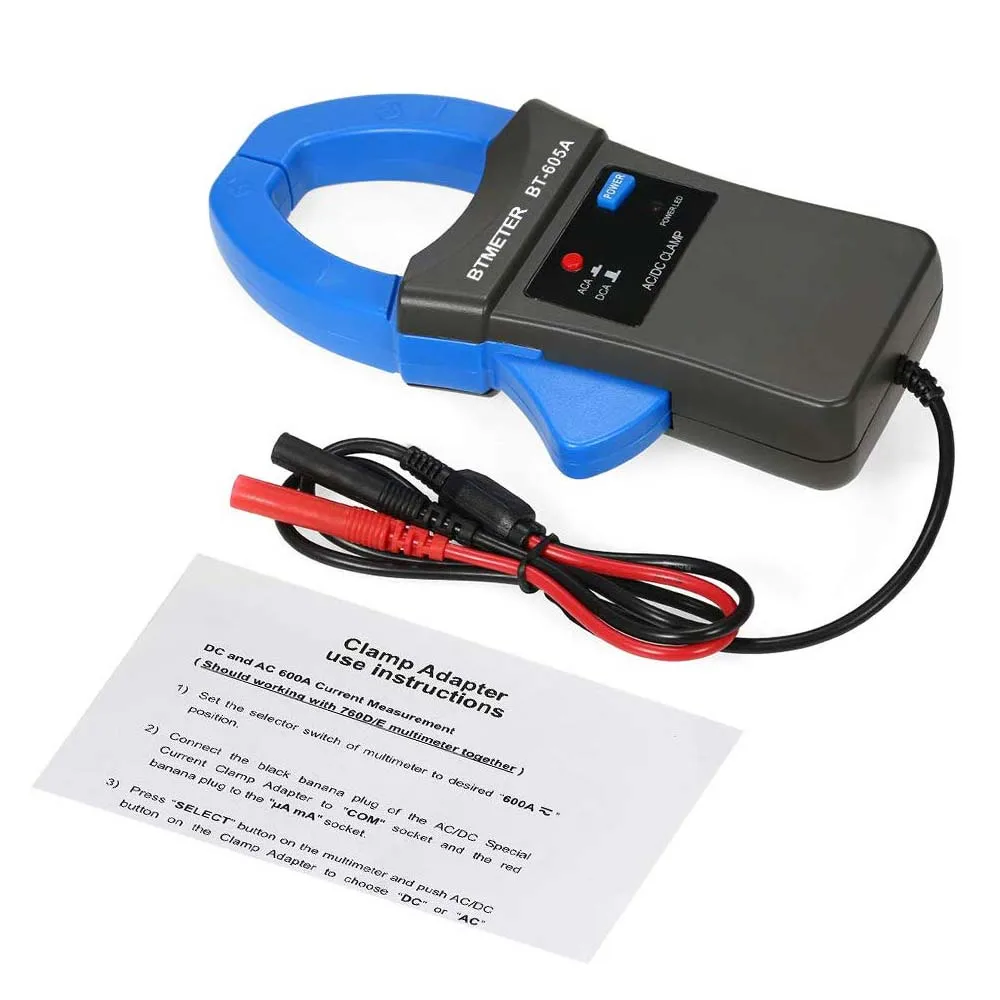【AC/DC 600A зажим-on probe】способен измерять AC/DC до 600 Ампер, BT-605A Зажим адаптер создан для более высоких измерений тока. 【Отличный Компаньон к DMMs】 1 мВ на Ампер выход и стандартные 3/4 дюймовые банановые вилки делают его совместимым с большинством мультитестеров, которые оснащены чувствительностью 1МВ. [Точные измерения Ампер] +/- 3.0% + 10 точность для преобразования выходного сигнала. Стрелка на челюсти указывает направление тока постоянного тока положительного тока (от положительного до отрицательного) 【Легкость use】maximum челюсти Калибр Размеры до 1,77 дюймов (45 мм), позволяет делать точный переменного или постоянного тока, сила тока измерения до 600 Ампер без разрыва цепи. 【Tips】 надев зажим усилителя на шнур питания, вы не получите чтение, вам нужно будет поставить зажим усилителя только вокруг живого провода, или использовать «сетевой сплиттер переменного тока».