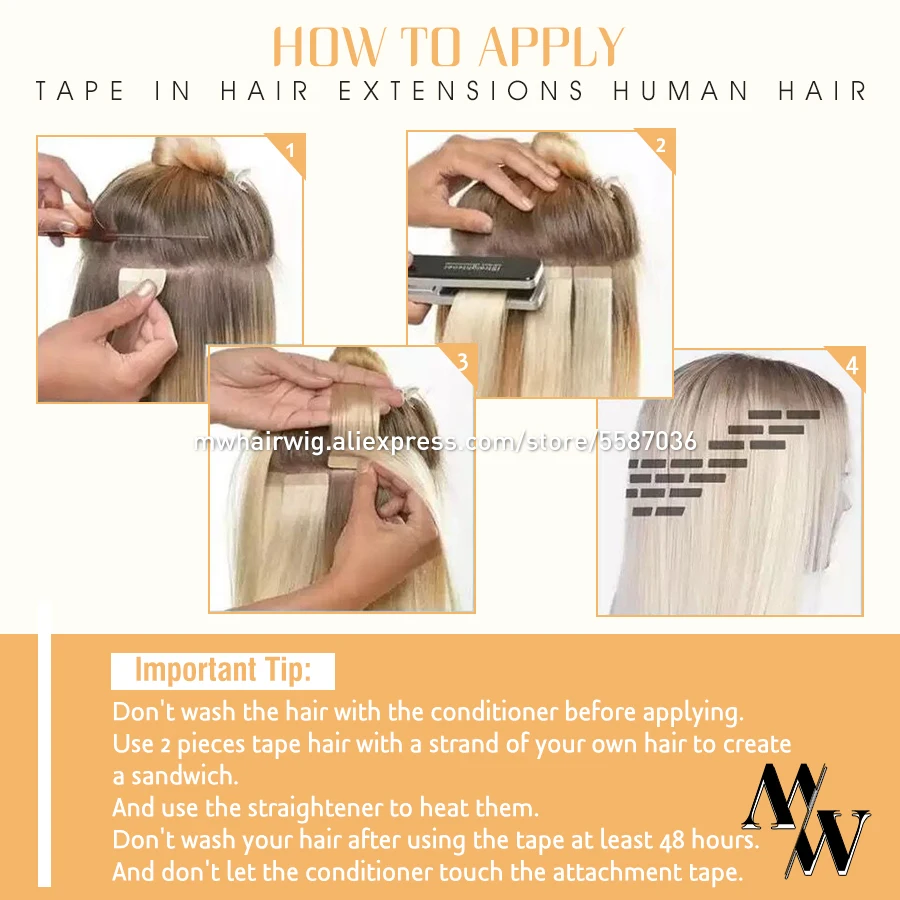 MW лента для наращивания человеческих волос, блонд, черный, натуральные волосы Remy, прямые волосы, невидимые на клеях, 12 "-24"