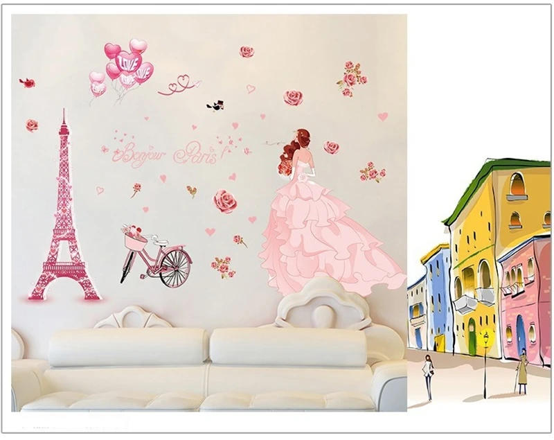 DIY корейский романтическое свадебное платье девушка стикер стены розовый Эйфелева башня Сердце Наклейка Роза девушка спальня пара комната Домашний декор росписи