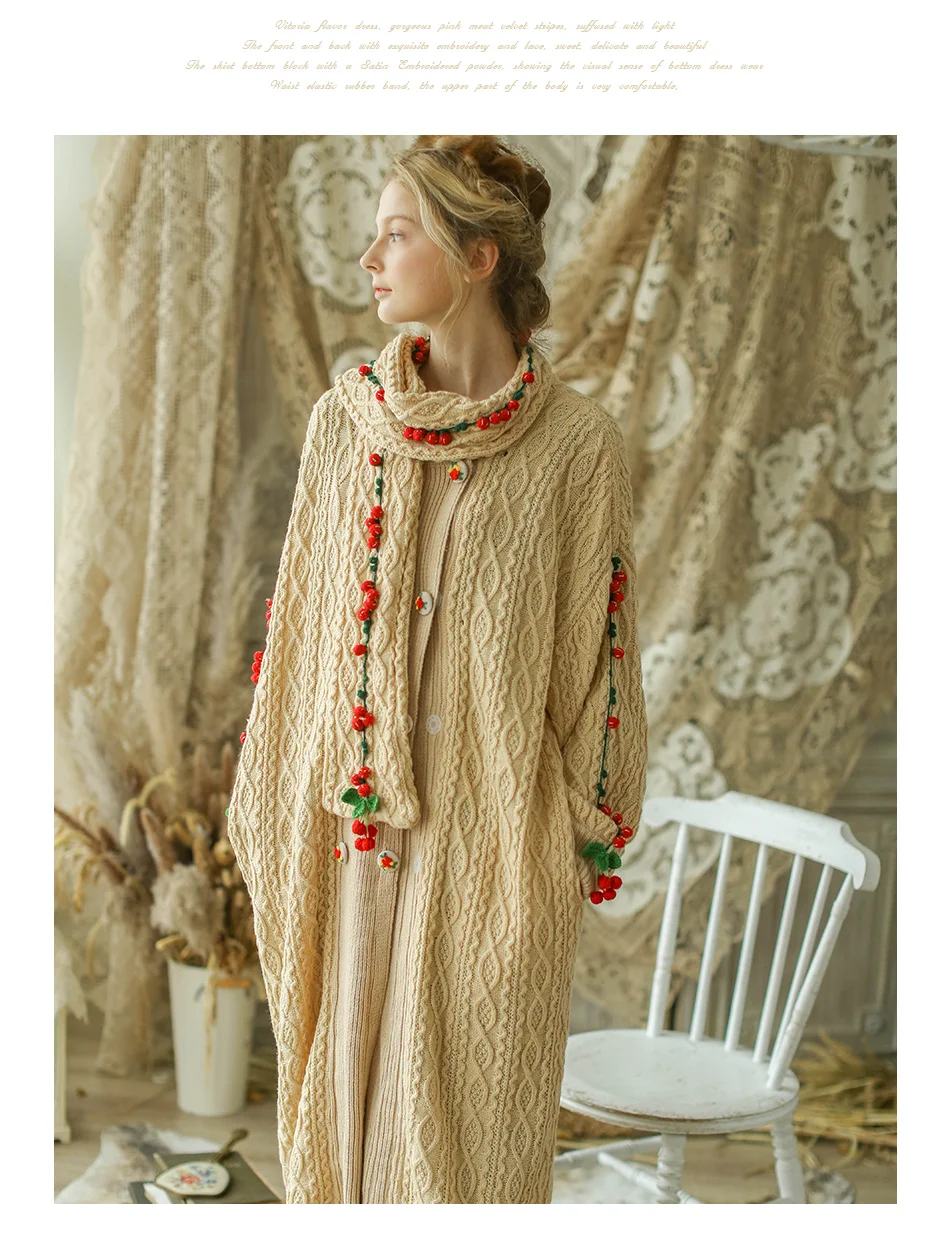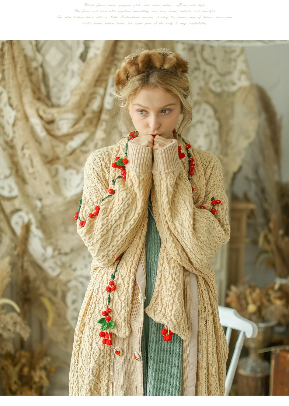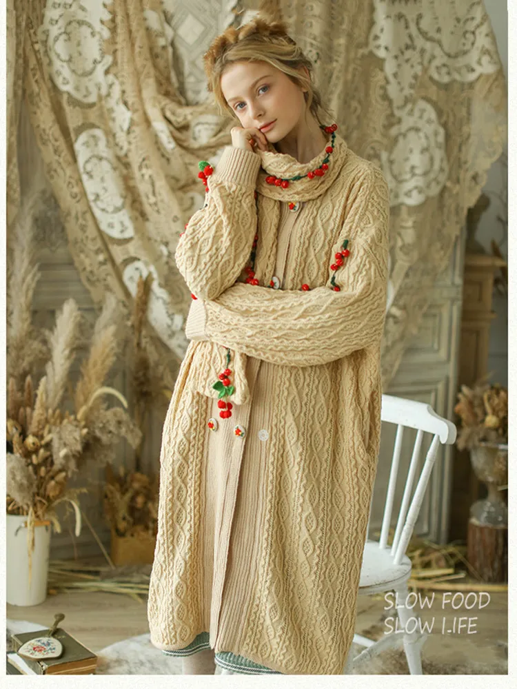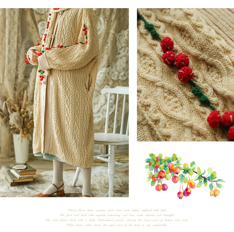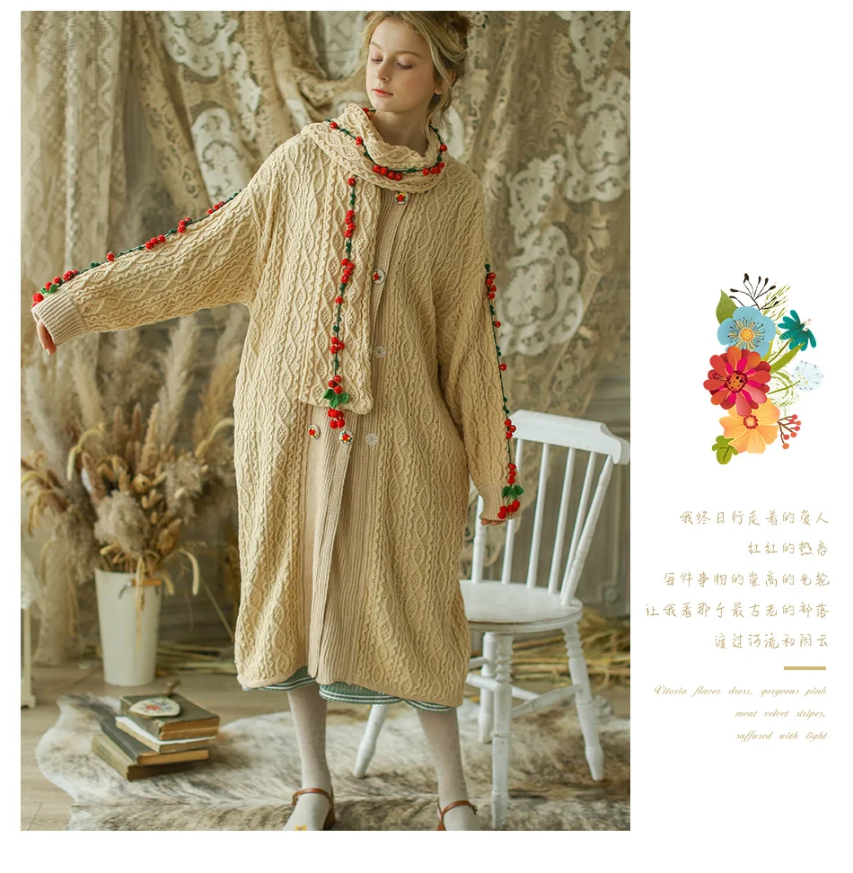 Женский осенне-зимний винтажный Повседневный очень свободный длинный шерстяной свитер для девушек Mori Girl, милый вязаный кардиган ручной работы с красным шариком, негабаритное вязаное пальто, кардиганы Основной материал: шерсть Цвет: хаки Воротник: шарф-воротник Рукав: длинный рукав
