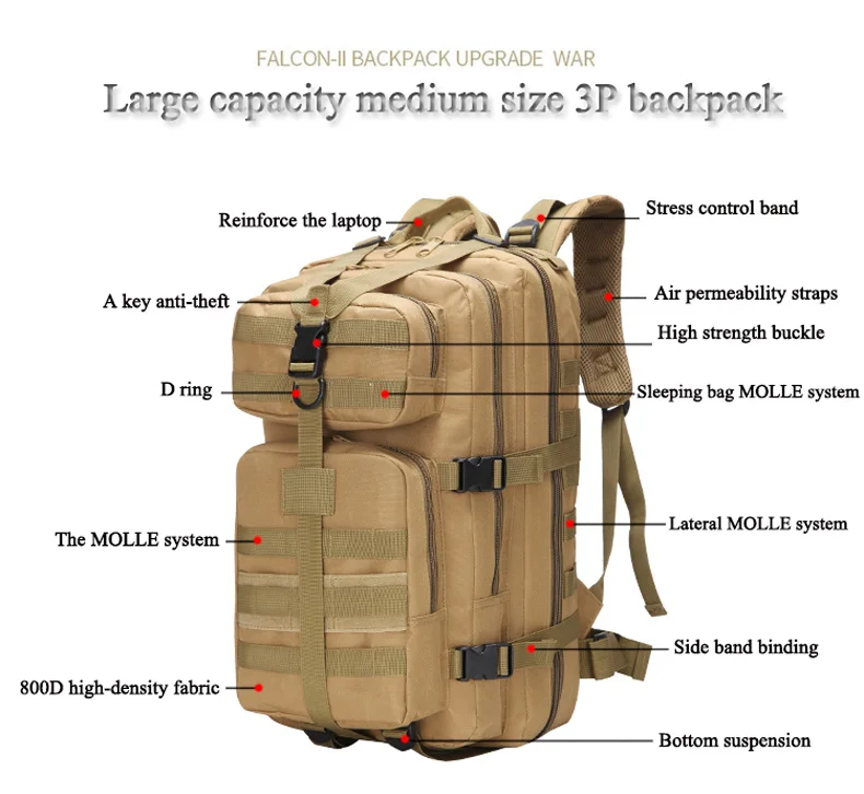 1. Рюкзак 3P-это рюкзак, который используется для переноски трехдневного туристического оборудования, продуктов питания и личных вещей. На основе A-III рюкзака система лямок MOLLE добавляется к периферийной части рюкзака, что облегчает крепление других небольших сумок и более удобно использовать его.