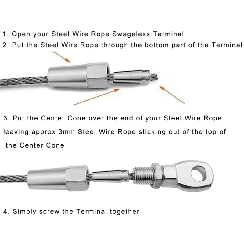 This wire rope cable fitting allows wire rope/cable to be terminated with no specialist tools