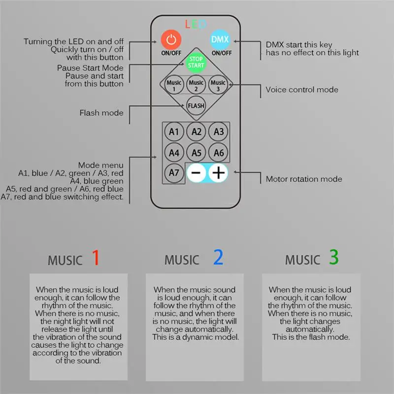 Сценический светильник может автоматически изменить свой светильник производительность в соответствии с ритм музыки. Вы можете выбрать три музыкальных режима. Режим «Музыка 1»-Когда музыка достаточно громкая, светильник меняется в соответствии с музыкальным ритмом; Когда музыка останавливается, светильник выключается. Музыка 2 режима-в тех случаях, когда музыка достаточно громко, в светильник меняется в зависимости от ритм музыки; В тех случаях, когда музыка останавливается, светильник превращаются в светильник Автоматическая смена режима. Режим «Музыка 3»-Когда музыка достаточно громкая, светильник меняется в соответствии с музыкальным ритмом; Когда музыка останавливается, светильник превращается в мигающий режим.