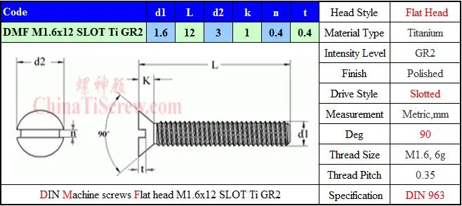 У нас есть DIN 963 титановые винты M1.6x3 M1.6x4 M1.6x5 M1.6x6 M1.6x8 M1.6x10 M1.6x12 в наличии. Плоская головка, шлицевая головка, Ti GR2, полированная.
