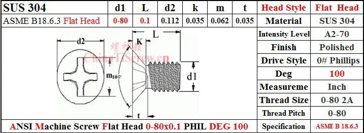 Мы предлагаем винты ANSI 0-80x0.1, СОГЛАСНО ASME B18.6.3-2002, плоская головка, DEG = 100,0 # Phillips драйвер, A2-70, равнина.