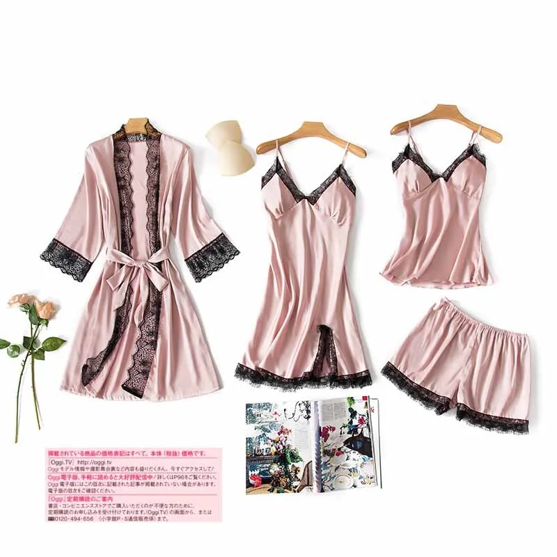 Многоцветная имитация шелка, 4 упаковки, зимний теплый пижамный комплект, женский сексуальный кружевной халат, пижама, пижамный комплект, пижама без рукавов